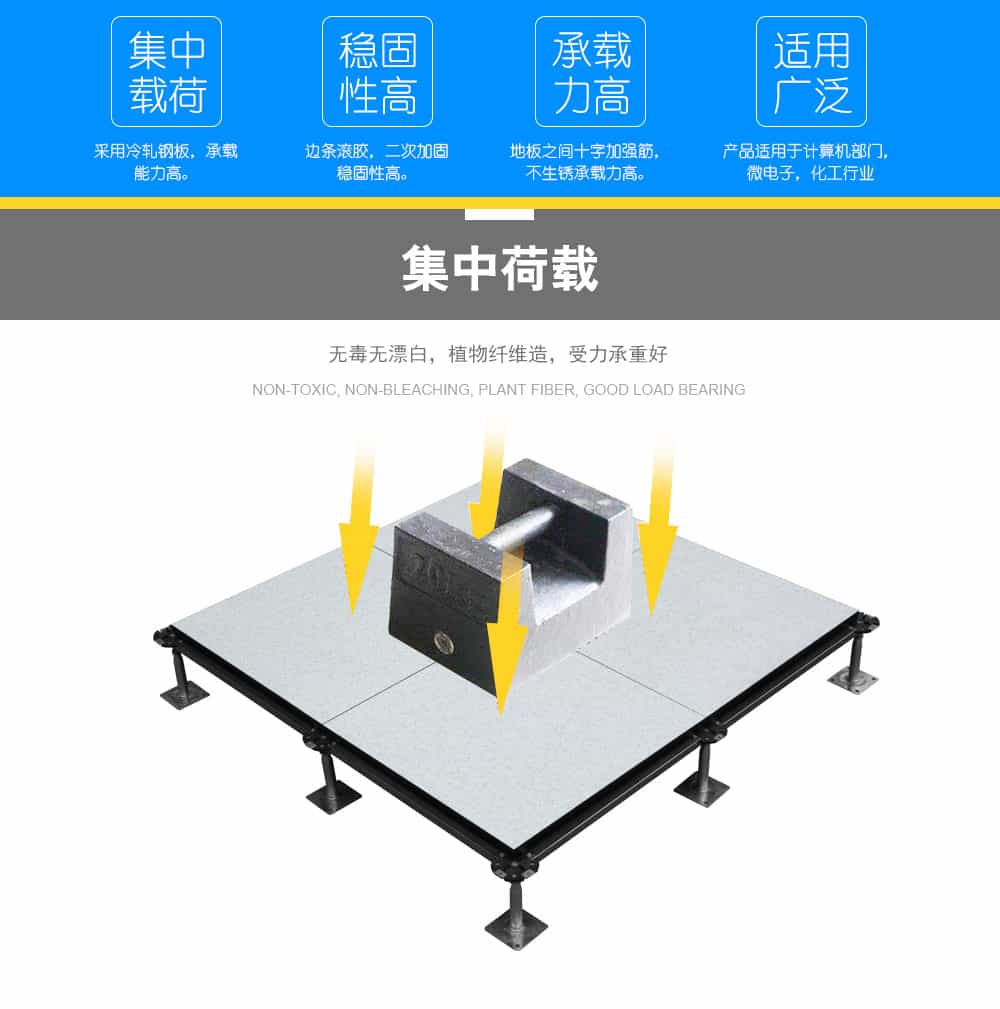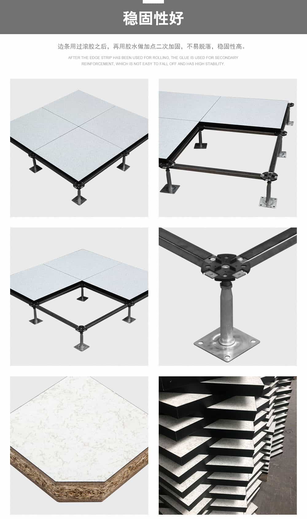 歐式復(fù)合地板,板芯采用、未經(jīng)加工的中高密度刨花板基,上面粘貼HPL(防火板)、PVC、陶瓷、等不同裝飾面層,下面粘貼鍍鋅鋼板/鋁板/鋁箔,四周導(dǎo)靜電黑膠條封邊,阻止機械損壞及潮濕變形。通過阻燃劑的添加,使其達到B1級防火,且具有較輕的自重,達到更高的承載能力和環(huán)保水平,標配出口型加重配件。