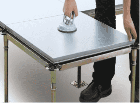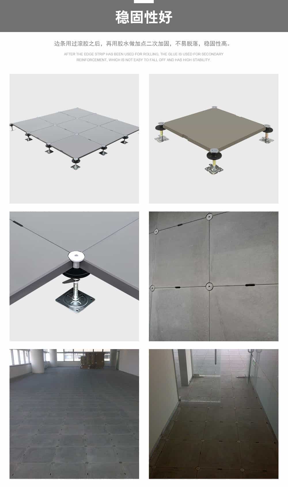 無(wú)機(jī)質(zhì)網(wǎng)絡(luò)地板是由硅酸鹽、無(wú)機(jī)纖維、礦物纖維、石英砂等材料經(jīng)過(guò)高壓一次成型的環(huán)保地板,每塊地板自帶穿線(xiàn)孔。地板四角鍍鋅底座支撐,不帶橫梁系統(tǒng)。每塊地板四角有90度圓弧,四塊板組合而成后形成一個(gè)圓,有一個(gè)鐵制螺母壓角固定。