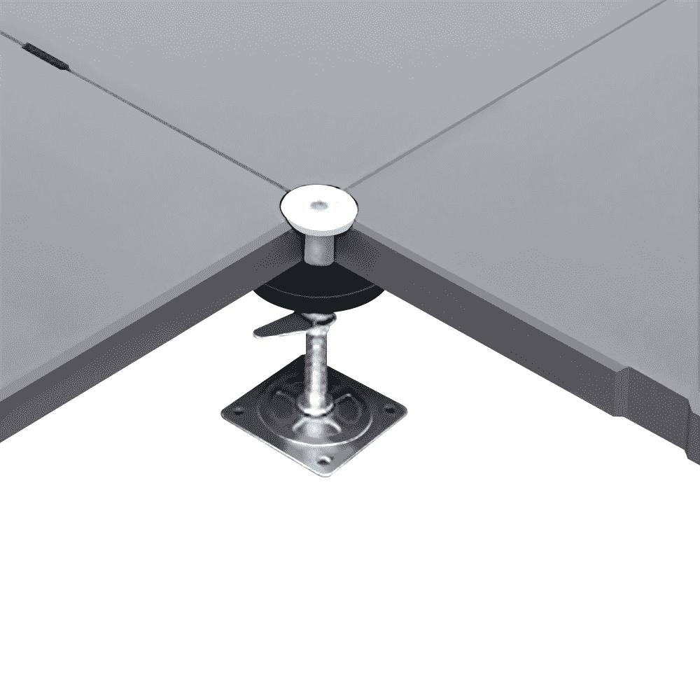 地板四角鍍鋅底座支承,不帶橫梁系統(tǒng)。每塊地板四角有90°圓弧,四塊板組合而成后形成一個(gè)圓,有一個(gè)鋁制螺母壓角固定。